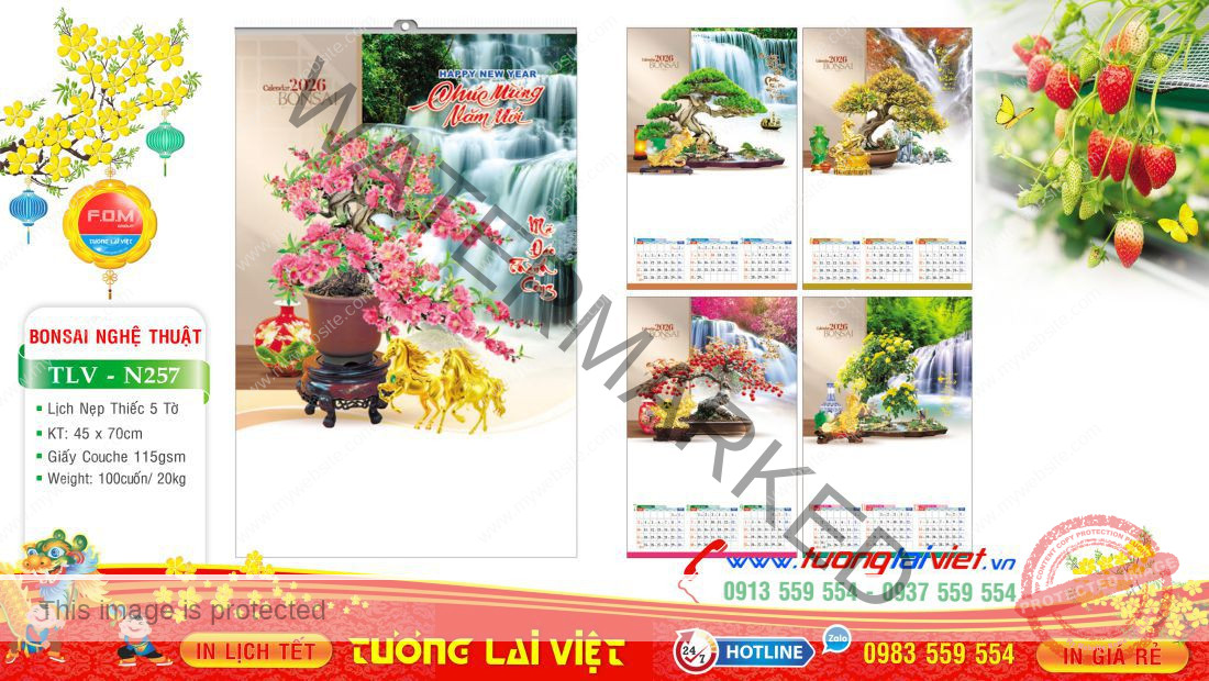 Lịch 5 tờ nẹp thiếc thường được in Offset 1 mặt trên giấy C105gsm, có kích thước: 36×70 và 45x70cm. Lịch treo tường 5 tờ Cây cảnh là mẫu lịch tờ treo tường giá rẻ nên được nhiều cửa hàng nhỏ lẻ chọn in lịch tết năm nay để làm quà tặng cuối năm cho khách hàng, bạn bè, đối tác và người thân nhân dịp năm mới.