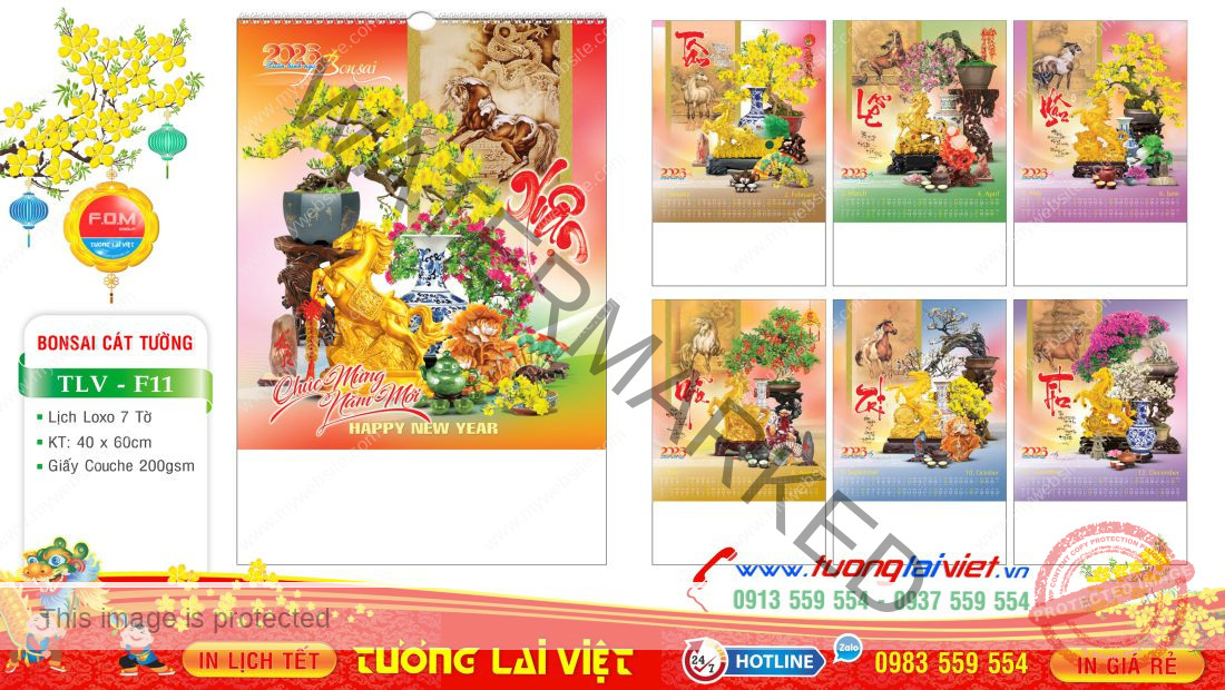 Lịch treo tường 7 tờ Bonsai cát tường được nhiều đơn vị chọn làm quà tặng cho khách hàng, đối tác và người thân nhân dịp năm mới. In quảng cáo lịch tờ treo tường như: In Logo, Tên công ty, địa chỉ, số điện thoại, email để quảng bá thương hiệu doanh nghiệp là phương pháp quảng cáo hiệu quả nhất với chi phí tiết kiệm trong thời điểm hiện tại.