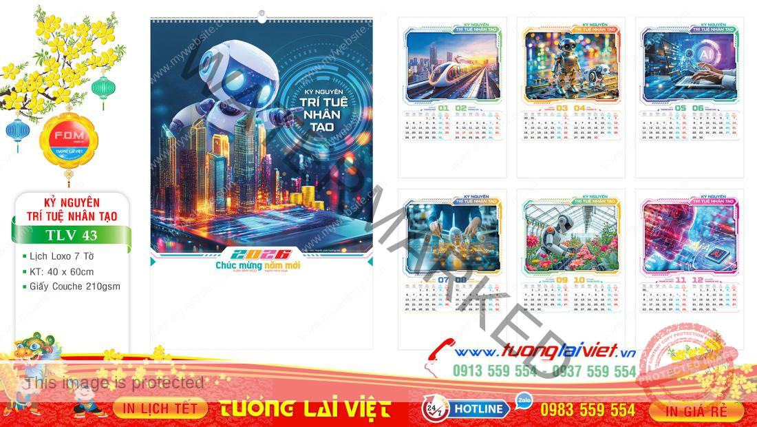 Lịch treo tường 7 tờ Trí tuệ nhân tạo được nhiều đơn vị chọn làm quà tặng cho khách hàng, đối tác và người thân nhân dịp năm mới. In quảng cáo lịch tờ treo tường như: In Logo, Tên công ty, địa chỉ, số điện thoại, email để quảng bá thương hiệu doanh nghiệp là phương pháp quảng cáo hiệu quả nhất với chi phí tiết kiệm trong thời điểm hiện tại.